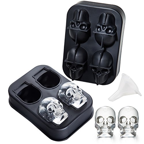 3D Skull Ice Mold-Food Grade Flexible Silicone Tray with Lid,Makes 4 Exquisite skull Ice Cubes for Your Whisky- Jelly,Candy,Chocolate Mold. Awesome Halloween Gift,BPA Free. (Funnel attached)