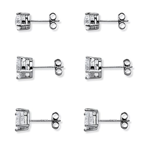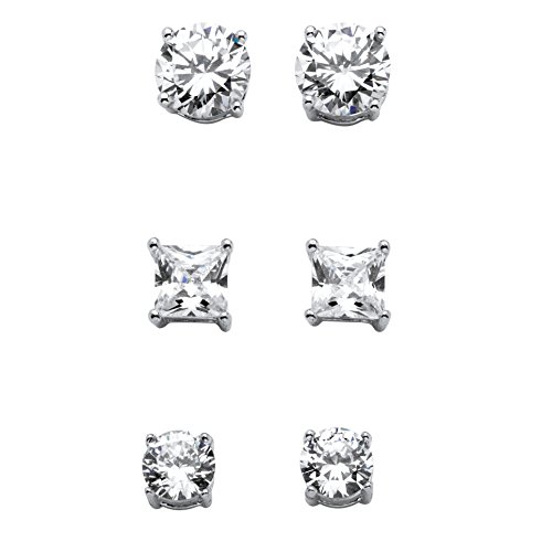 Three times the sparkle! With round or princess-cut styles, this three-pair set of cubic zirconia stud earrings offer variety and dazzling sparkle to whatever you're wearing. Every woman should own stud earrings -- now you'll have three pairs! 9.20 carats T.W. Rhodium-plated sterling silver. - 55533Feature
