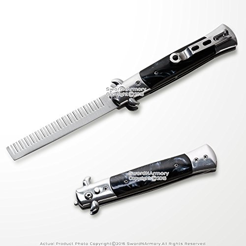 Studio : Etrading Publisher : Etrading Binding : Misc. Product Description This is the 9" Black Automatic Deploying Comb Switchblade Stiletto Hair Brush. What the quickest way to comb your hair? By using this automatic switch comb, you can deploy a stainless steel comb and use it while looking cool. Featuring a safety lever and a reversible belt clip, this little automatic comb can fit in your pocket for any occasion that you might need to comb your hair. 0