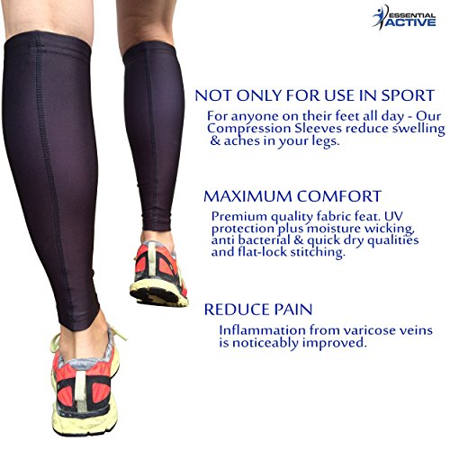 Make Your Legs Happier TODAY! You've found the ULTIMATE Solution That Effortlessly Turns Tired or Swollen Legs To Pain-Free Happy Ones DO YOU SPEND ALL DAY ON YOUR FEET, and the result is swollen legs and fatigue? SUFFER from an aching and heavy feeling in your legs, shin splints, calf cramps pain, deltoid ligament pain, varicose veins, or Plantar Fasciitis? Want to PREVENT blood clots, especially post-surgery or PREVENT injury when training? With ESSENTIAL ACTIVE'S premium compression sleeves for calves, your legs will be thanking you for years to come! VERSATILE SUPPORT for women and men, nurses and doctors, athletes and runners, retail and hospitality staff and anyone on their feet all day. Limit swelling, boost circulation and eliminate calf pain and aching legs ENHANCE YOUR PERFORMANCE in any sports: from running, cycling, cross fit, weight training, baseball, basketball, golf, soccer, yoga and pilates REHABILITATE YOURSELF - the ultimate results recovery wear! While running, vibrations in the muscles cause them to tire. Under compression the muscles can't vibrate as much, so they tire less GUARD YOUR LEGS - let your new compression sleeves mitigate shin splints and calf cramps and guard you from knocks and scratches. Effectively protecting your legs against abrasions and nasty things like poison ivy on the trail! Use them as RECOVERY GARMENTS and ACCELERATE THE RECOVERY PROCESS! Expertly designed to alter the inflammatory response to muscle damage and accelerate the repair process. Last, but not least, your legs will NOT GET as DIRTY! This is just a little BONUS on top of everything else. Stay In The Game Longer! Increase Endurance, Improve Performance, Train Harder, Recover Faster. Click the ADD TO CART button now to place your order and receive our FREE E-BOOK. We're in stock now! 0