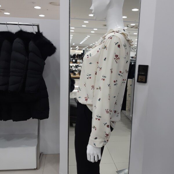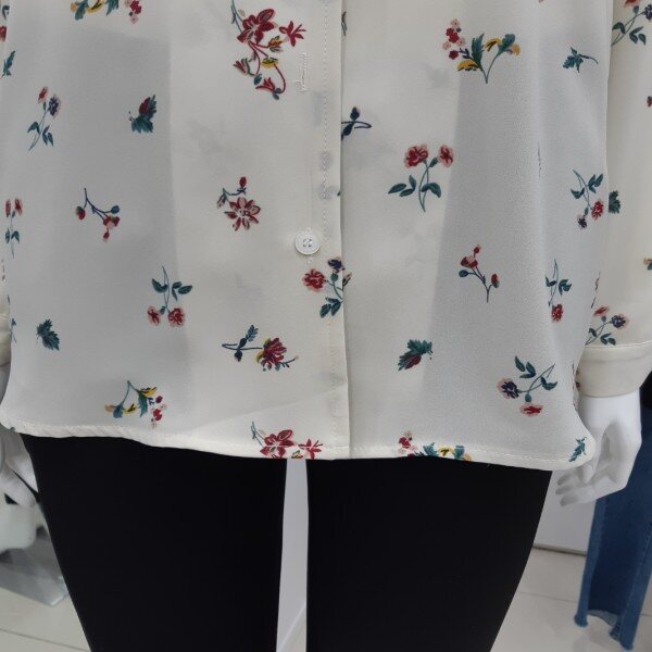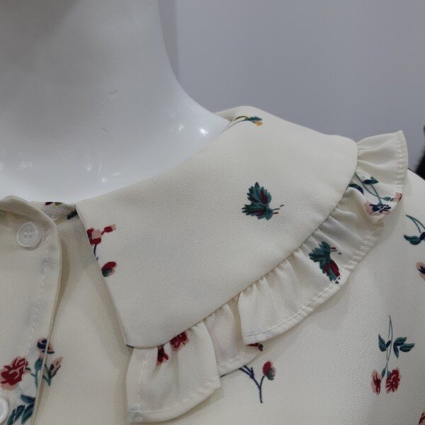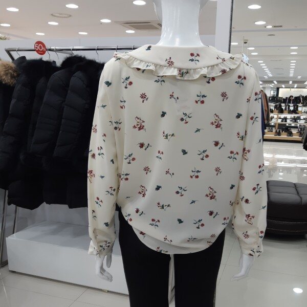 앞뒤로 이어진 큼직한 카라디자인 셔링디테일로 포인트 주었어요 비침이 살짝있는 쉬폰원단깔끔하게 슬랙스 포인트
