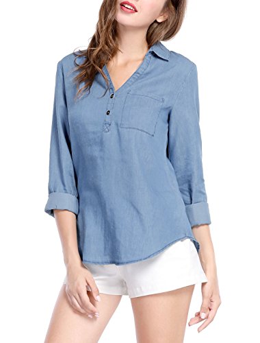 Allegra K Women's Half Placket Long Sleeves Pocket Denim Shirt