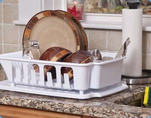 The Large 2 Piece Sink Set includes a dish drainer and drainboard which are held together with snap-lock tabs, yet detach easily for cleaning. The dish drainer features a unique system of channeled grooves to accommodate 14 plates, 7 small plate/bowls and 8 cups, along with ample room for flatware. The large size is ideal for family use