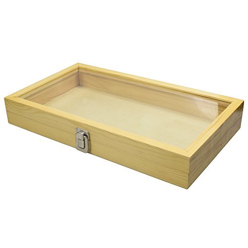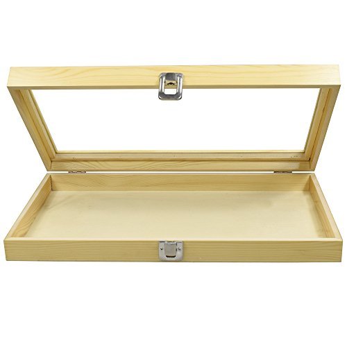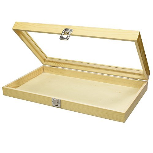 Mooca Large Natural Wood TEMPERED Glass Top Lid Metal Clip Jewelry Display Case, 15" x 8 1/2" x 2 1/8"