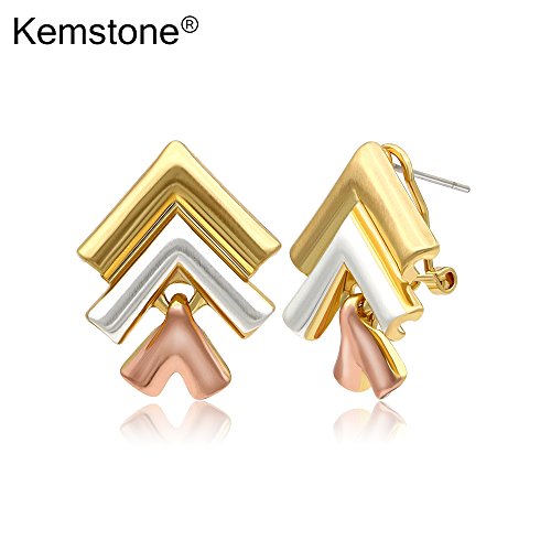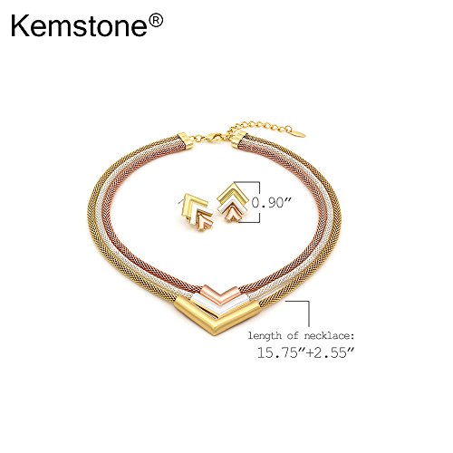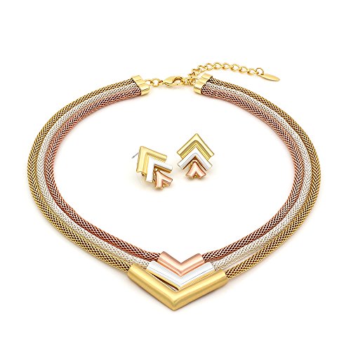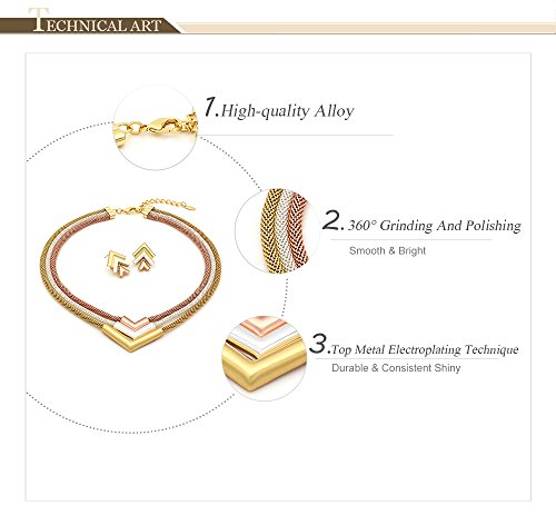Made of base metal alloy, this jewelry set features arrow design with shiny tri-color of rose gold, yellow gold and silver plated finish. The necklace is 15.7"and adjustable to 18.3" with the additional extender. Matching earrings are showcasing same design and are secured with post backings. This jewelry set will make the perfect choice for your special someone for Valentine's gift, Christmas gift, Mothers day gift, Birthday gift, Anniversary Gift, etc.Feature
