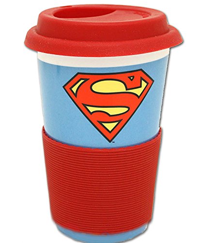 Superman 10 oz Porcelain Coffee Cup with Silicone Grip Sleeve & Lid. Officially licensed. Dishwasher Safe and Microwave Safe