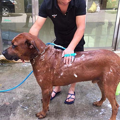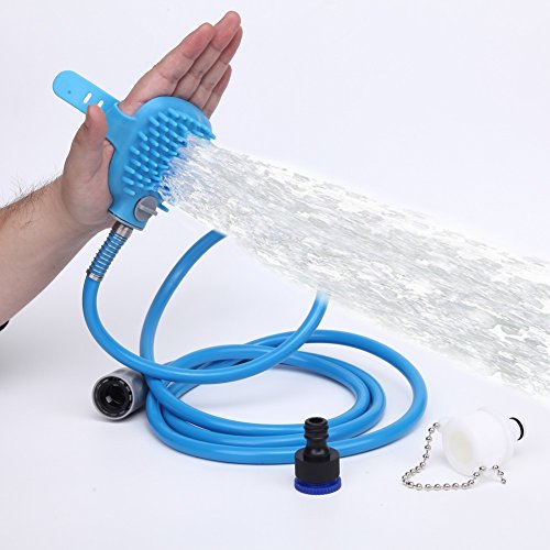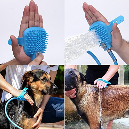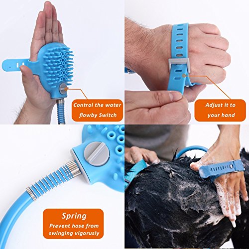 The Pet Bathing Tool is the world's first wearable combination sprayer-scrubber that puts the control of water in the palm of your hand.? Sprayer AND Scrubber in Your Palm Water sprays from rubber scrubbers in your palm, allowing you to soak, scrub, and rinse your pet by injecting water deep into their fur. The Multi-Functional Dog Shower lets pets enjoy showers indoors/outdoor, anytime. The Pet Bathing Tool is slim and doesn't impede your dexterity. Use the adjustable strap on the back to fit hands of all shapes and sizes. EASY INSTALLATION 1. Quick-connects to garden house or shower 0.6 inches standard faucet 2. The installation is completed in three minutes with 2 hose adapters 3. It also has a release for the shower hose so you can remove it when not in use. 4. Switches can be easily controlled by hand.