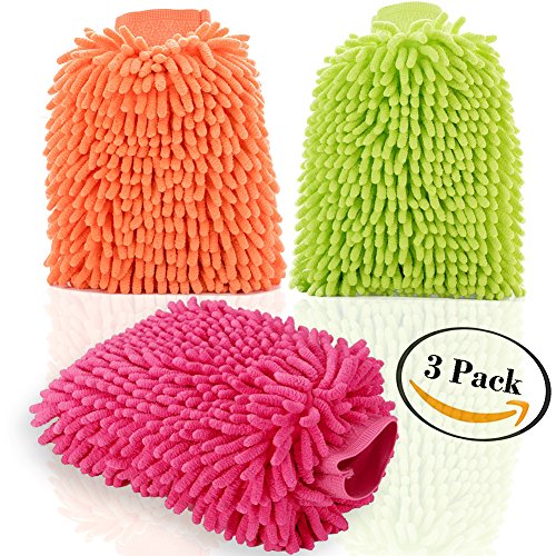 3Pcs Waterproof Microfiber Car Wash Mitts Premium Chenille Ultra-soft Scratch-Free Lint Free Gloves Absorbent Dusting Polishing Cleaning Sponge Cloth Kit Wet or Dry Use, Rose Red Green Orange