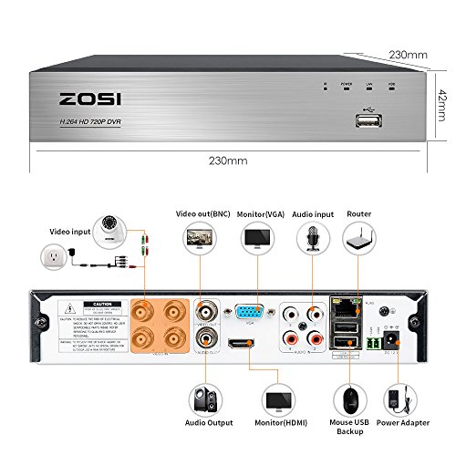 -. Feature : ZOSI H.264 8 channel 720P Digital Video Recorder ,Includes 4x 1280TVL bullet Outdoor Security Cameras. include 1TB Hard Drive / DVR Equiped with HDMI/VGA/BNC port for multi video output, 720P Recording Resolution. HDMI Port for 1080P High Resolution Viewing / Build-in 24pcs IR led with IR Cut Filter ensures true color under all lighting conditions day or night, night vision up to 20meter (65 feet) / Email Notification & Mobile Push Alerts when Motion Detection,Free Apps for Live View and Playback on Smartphone.Support USB port Back up , gives you the easiest option of backing up and transferring your video footage to a USB flash drive / Two year quality Warranty, Life time Tech Support ! If your product stops working in the first year we will replace it.