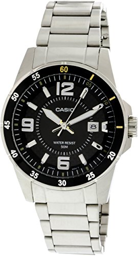 Brand, Seller, or Collection Name:Casio Model number:EAW-MTP-1291D-1A2V Part Number:MTP1291D-1A2V Item Shape:Round Dial window material type:Mineral Display Type:Analog Clasp:Fold-over-clasp-with-safety Case material:Stainless steel Case diameter:46 millimeters Case Thickness:10 millimeters Band Material:Stainless Steel Band length:Men's Standard Band width:25 millimeters Band Color:Silver Dial color:Black Calendar:Date Special features:Luminous, measures-seconds Item weight:5.60 Ounces Movement:Quartz Water resistant depth:200