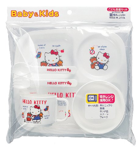 Hello Kitty design toddler food wear gift set, includes: 1 bowl, 1 cup, 1 fork, 1 spoon and 1 toddler plate, made in Japan.