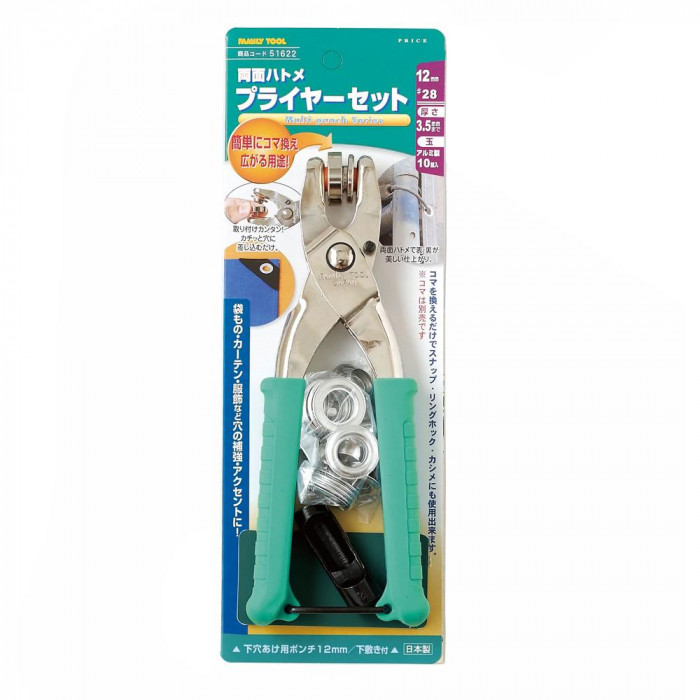 fk094igrjs強度が優れ、表・裏が美しく仕上がる両面ハトメ サイズ 個装サイズ:3.2×27×9.5cm 重量 個装重量:350g 素材・材質 アルミ 仕様 ■12mm(♯28)(厚さ約3.5mm迄)ハトメ玉:10組入り ■下穴ポンチ12mm ■下敷き 生産国 日本 袋もの・服飾などの穴の補強・アクセントに ※別売りのイチネンミツトモ 真鍮製ハトメ玉をご使用になる際は、8mm(♯22)以下をご使用下さい 強度が優れ、表・裏が美しく仕上がる両面ハトメ