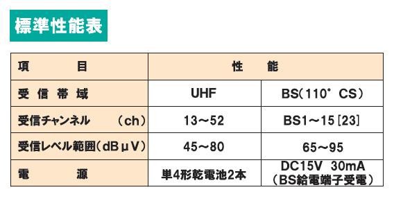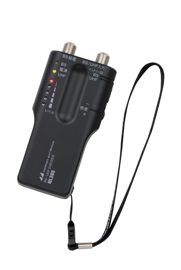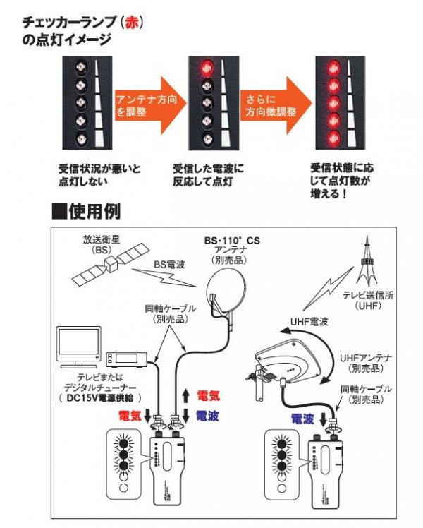 UHFアンテナおよびBSアンテナを設置する際に電波の強い方向が確認できます。UHFチェックは付属の乾電池で動作します。BSチェックはデジタルチューナーなどからのDC15Vで動作します。 |
