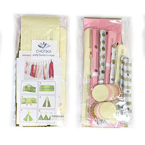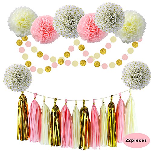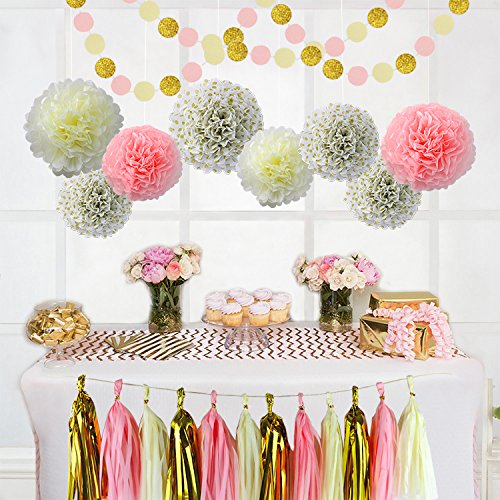 Sweet Pink Gold party supplies kit includes 8 tissue pom poms in 12inch, 10 inche and 8 inch, 12 paper tassel garlands and 2 Gold Glitter round circle paper garland, easy to fold, ships flat. All in one kit and you can make a fantastic look with all these pompoms tassels garlands.