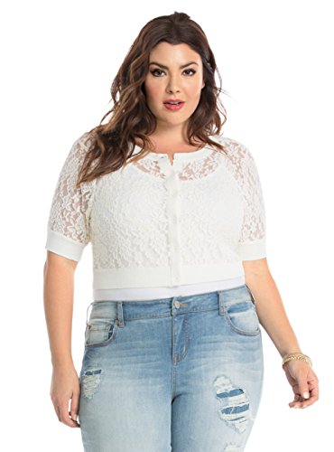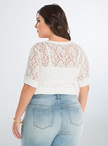 A romantic topper to any outfit, this ivory lace shrug is ideal for sweetening up your look (and keeping that nip in the air in check). The stretchy ribbed knit trim lends definition to the cropped cut, a button front keeps the sheer style secure. Model is 5'9", size 1Feature