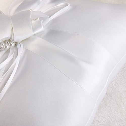 Package Including 1 * Ring Bearer Pillow Flower Buds Faux Pearls Decor Wedding Ring Pillow with Ribbons 10 Inch*10 Inch (Pure White)