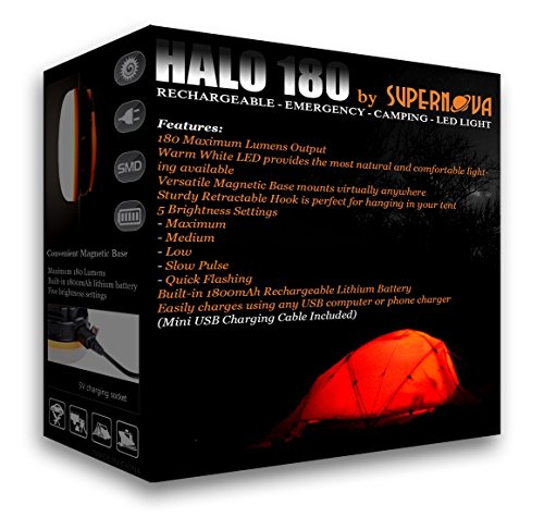 - Title : Supernova Halo 180 Extreme Rechargeable LED Camping and Emergency Lantern - The Brightest Most Versatile Tent Light Available - Backpacking - Hiking - Auto - Home - College - Scouting (Cadmium Orange)