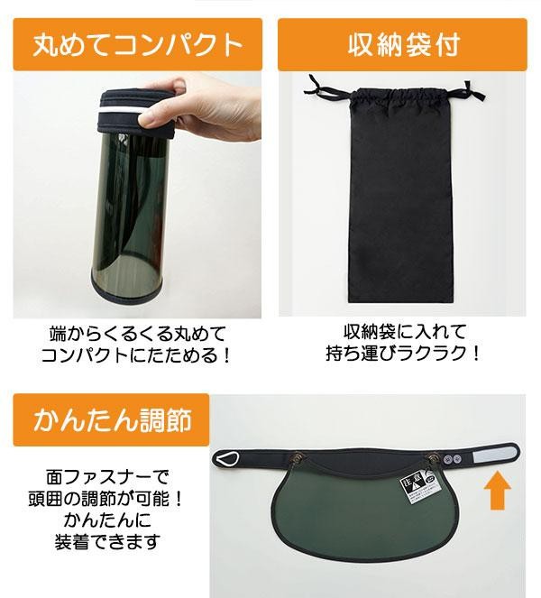UVカット率99%以上!偏光フィルム採用で目にやさしいサンバイザー。使用しない時は、くるっと丸めて収納袋に。 |