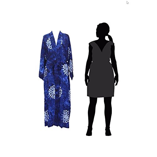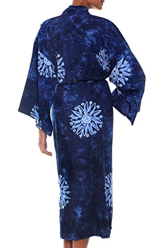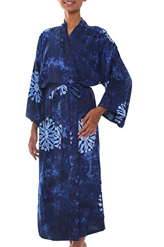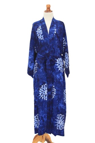 About this item: Florid stars illuminate the midnight sky in a fabulous robe from Nyoman Nadri. It is crafted with traditional Indonesian batik techniques over which the motifs are painted by hand. The cross-over robe features ample sleeves and ties with a wide belt. This handpainted batik robe is a truly original work of art. Sunlight, water, dye and temperature all factor into the look of the finished robe. This should be considered a unique design made especially for you. Colors and pattern placement will vary. Robe :52.0" Length (from high-point shoulder) x 48.0" Bust/chest x 27.0" Sleeve (center neck to cuff) Belt :59.0" L x 2.0" W - One size fits most