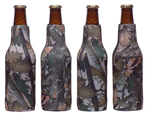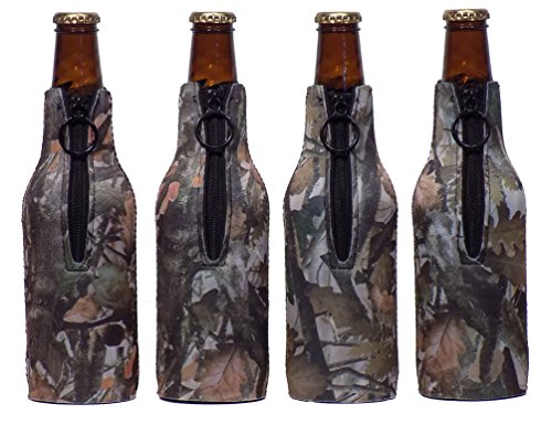 Four(4) hunting-themed realistic camouflage bottle coolers with zippers. Each cooler has a unique nature pattern.