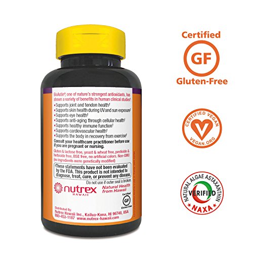 BioAstin Hawaiian Astaxanthin is derived from natural Haematococcus pluvialis microalgae, grown in Hawaii, under the intense Hawaiian sun, the way Mother Nature intended. Astaxanthin is a red carotenoid and an exceptionally powerful antioxidant that can give you results you can feel. Astaxanthin is best absorbed when taken with food that contains fat (e.g. nuts, avocado, coconut oil, etc.) • Nutrex Hawaii, founded in 1999, is the leading producer of natural microalgae supplements from Hawaii. Farm to Bottle, we control the cultivation, harvest and processing of our Hawaiian Spirulina and BioAstin Hawaiian Astaxanthin products. Nutrex Hawaii is GMP (Good Manufacturing Practices) third-party certified. All of our products are pesticide and herbicide free, non-GMO, free of gluten, soy, lactose, and preservatives.Feature
