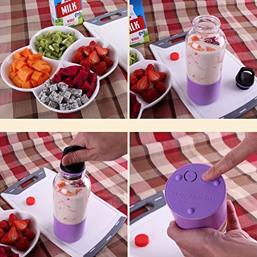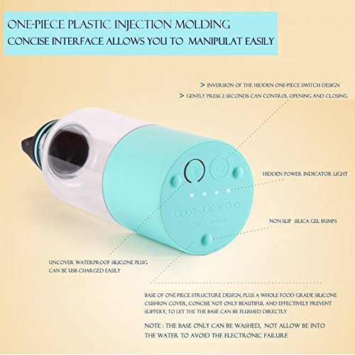 ECVILLA Rechargeable Juicer Cup Portable Juice Blender for Traveling / Working / Outdoors Product Features: ♦ Healthy and environmental friendly, food grade non-toxic material that can be used safely. ♦ Fashionable & Generous. Not only a juice blender but also water cup. ♦ Portable and Light-weight design make you can use outdoors, camping, travel, yourself or family. ♦ Its imported thick transparent body designed from natural watery art that make you feel the touching beauty with your sincere praise. Specifications: - Battery capacity: 2600mah - Speed of Motor: Empty 22000 R/M±15% Loaded 15000R/M±15% - Charging time: about3 hours - Usage count: about 12 times - Battery type: Polymer battery - Input voltage:5V 1.5A - Output voltage:5V 2.0A 2600mAh - Materials: Imported food-grade PC/PP & 304 stainless steel. HOW TO USE: 1. Full charge the battery before first time use. And make a complete clean of parts which contacts juice material. 2. Prepare the fruit you like, cut them into 1.5cm. 3. According to your personal taste, add water or milk to 30%-60%, put the fruit in and make them lower than 80% of the bottle. 4. Press the button. It takes 60-90 seconds for tasty juice base on the softness of fruit. Turn off the machine and Gently shake the bottle at 10 sec to make it more delicious. Package Includes: - 1 * Juicer Cup - 1 * USB charging cable - 1 * User manual WARNING! 1. Don't touch the power button and blades when cleaning. Keep away from children to prevent accidents from blades. 2. Don't open the cup during operation, or put your hand or other hard stuff into the unit, to prevent accidents or damage of unit. 3. Don't run it with nothing inside. Don't force the juicer to operate under heavy duty to prevent overheat of electronic components, which may leads to reduction of life time of product.Feature