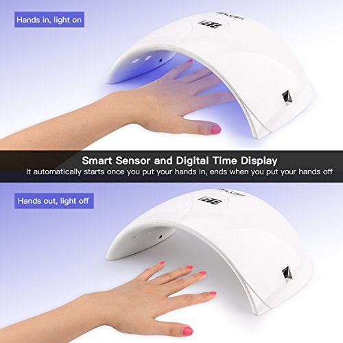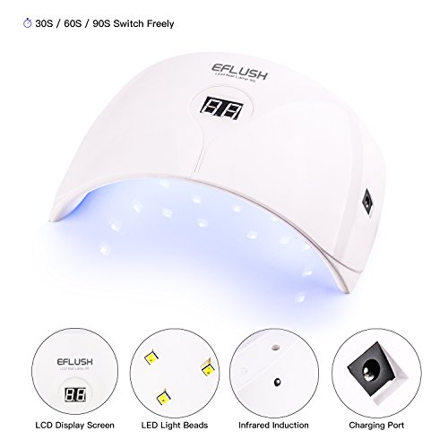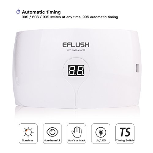 Studio : Eflush Publisher : Eflush Binding : Misc. Product Description Easy to cure 3 Timer Settings: 30s, 60s, 90s. Automatic sensor: hand in, lights on; hand out, lights off. Digital screen No need for a separate timer, no longer have to push buttons or set a timer over the gel nail lamp, it will automatically shut off at 90 seconds. Infrared Intelligent Sensor Built-in infrared signal receiver - avoid overheat and unnecessary waste of power energy. Give you added peace of mind with every use. PROTECT EYES AND SKIN Closer white light protects your hands and eyes, avoiding harm from outdated nail dryer. Long lifespan Completely adopt LED light, rated at 50000 hours, a nail lamp that can accompany you the whole life.? Compact and light weight Compact and light weight design, easy to carry, allows you enjoy manicure at anytime anywhere. Brand: Eflush Type: Nail Nursing Tool Material: PC ABS Plug Type: US plug Power: 24W Wave Length: 365nm 0