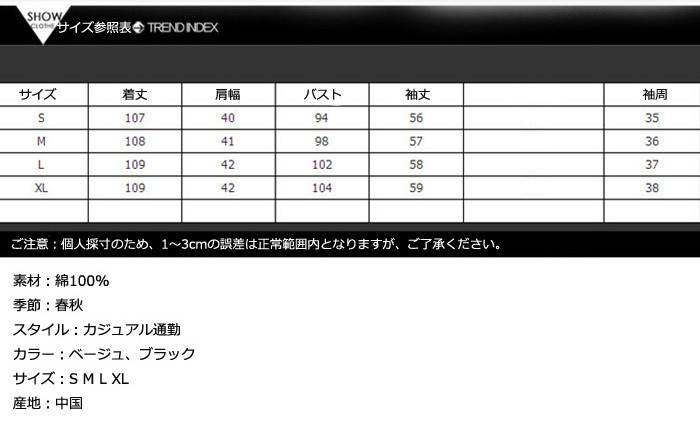 トレンチコート 春 トレンチコート ブルゾンジャケット 春 ma-1 大きいサイズ スプリングコート 春コート ロング 通勤 結婚式 2018春秋新作 スプリングコート レディース トレンチコート 春アウター ロングスリムフィットのトレンチコート2018年人気新登場!フィットしたウエストとボディラインにぴったりと沿ったシルエットが特徴です。季節やシーンを問わず活躍するワードローブの定番として、ベルトを締めたシックなスタイルから、ドレスやデニムの上からラフに羽織るコーディネートまで幅広く着こなせます。商品詳細素材:綿100%季節:春秋スタイル:カジュアル通勤カラー:ベージュ、ブラックサイズ:S M L XL産地:中国サイズ参照表S 着丈107cm 肩幅40cm バスト94cm 袖丈56cm 袖周り35cmM 着丈108cm 肩幅41cm バスト98cm 袖丈57cm 袖周り36cmL 着丈109cm 肩幅42cm バスト102cm 袖丈58cm 袖周り37cmXL 着丈109cm 肩幅42cm バスト104cm 袖丈59cm 袖周り38cmご注意:個人採寸のため、1~3cmの誤差は正常範囲内となりますが、ご了承ください。トレンチコート 春 トレンチコート ブルゾンジャケット 春 ma-1 大きいサイズ スプリングコート 春コート ロング 通勤 結婚式 2018春秋新作 スプリングコート レディース トレンチコート 春アウター ロング