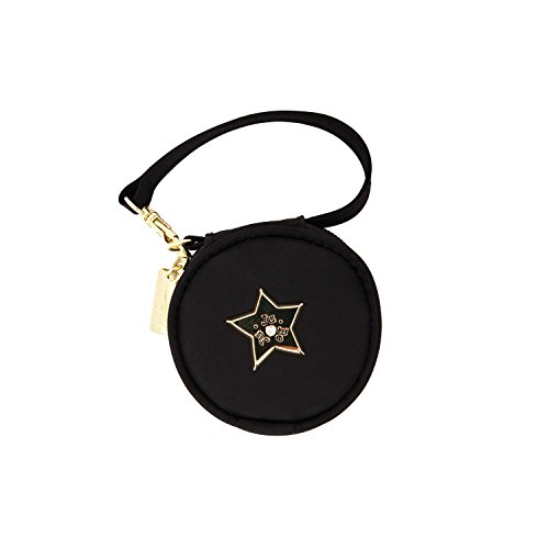 Interior elastic securely holds 2 pacifiers with a wristlet strap, detachable with a swivel hook