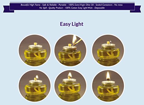 100 % extra virgin olive oil - Beautiful High Flame - Sealed Containers - NO SPIL-NO MESS - 100% Cotton Easy Light Wick