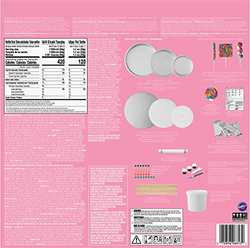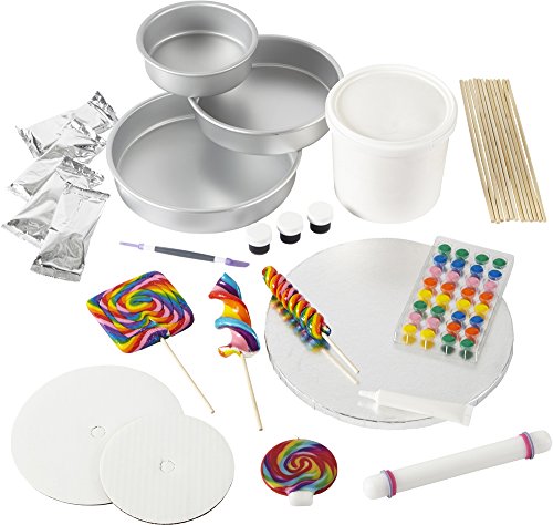 - Kit includes: cake pans, lollipops, cake boards, cake base, candle, white decorating gel, white fondant, pink fondant, red fondant, Wilton Decorating Gel for tinting, fondant knife/needle tool, white creamy decorator icing, bamboo dowel rods, soft sugar icing dots, decorating instructions