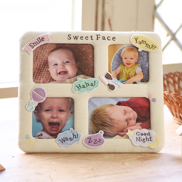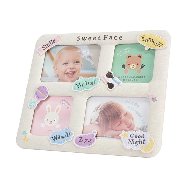 壁掛け用のリボン付き。「Sweet Face」(かわいいおかお)「Smile」(笑顔)、「Haha!」(ははっ!(笑い声))「Waah!」(うわーん!(泣き声))「Yummy!」(おいしい!)「Good Night」(おやすみ)、「ZZZ」(寝息)お子さまのいろいろな表情(笑顔・泣き顔・おいしい顔・寝顔)を飾って楽しめるフォトフレームです。リネンやフェルトのファブリックや刺繍の温もり溢れるベースに、吹き出しのワッペンがとてもかわいらしいフォトフレーム。寝顔も笑顔も泣き顔も…日々いろいろな表情で成長を感じさせてくれる、かけがえのない大切なお子さまの時間は、とっておきのフォトフレームに。一緒に眺めておしゃべりするのも楽しいアイテムです。リネンやフェルトなど布系のやさしい素材に刺しゅうを施したフォトフレームです。周りの人すべてを幸せな気持ちに変える、こどもの笑顔。そしてすくすくと成長していく日々は、驚きと喜びの連続です。愛すべきこどものとっておきの瞬間を飾るなら、とびきりキュートなフォトフレームで思い出とともに。