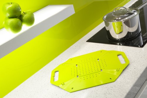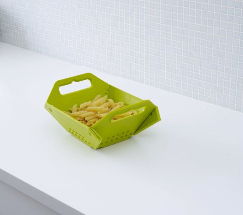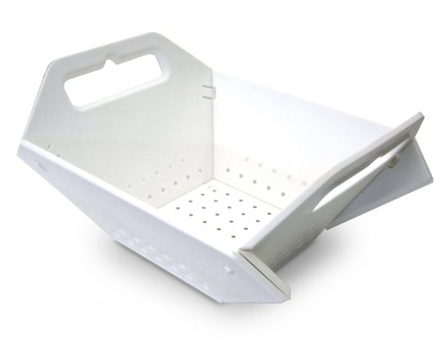 - Feature : Innovative, space-saving colander in white folds completely flat for easy storage / 12 hinges lock into position to ensure food stays in colander / When flat, colander measures 16.53 x 12.79 x 0.39 inches (LxWxH) / Made of molded polypropylene / Dishwasher safe