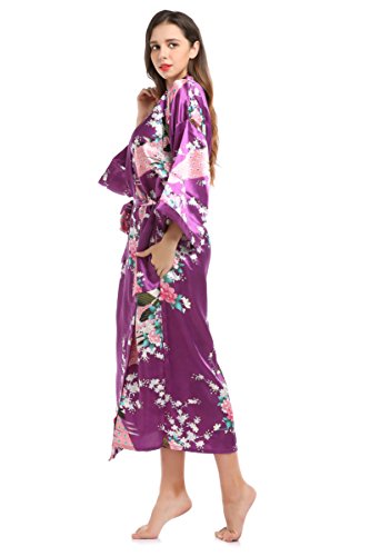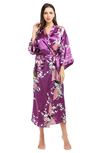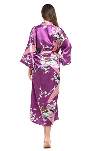 YueQiW Women's Kimono Long Robe- Silk Peacock & Blossoms With Pocket(X-Large,Purple)