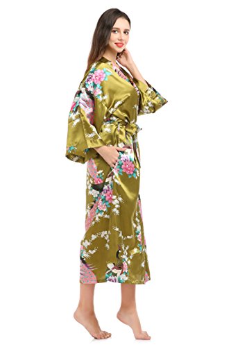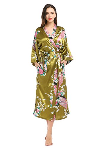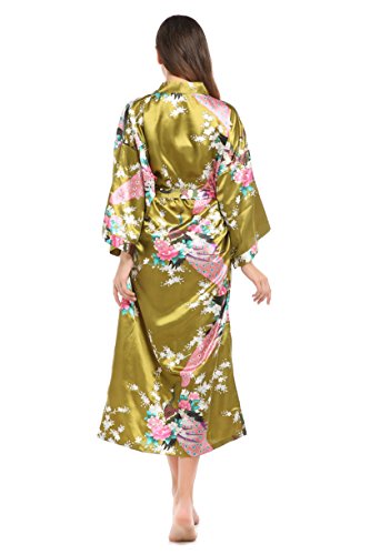 YueQiW Women's Kimono Long Robe- Silk Peacock & Blossoms With Pocket(Medium,Olive)
