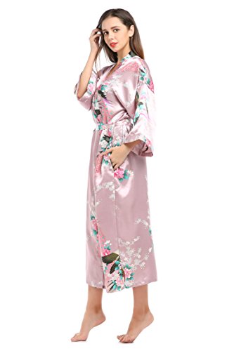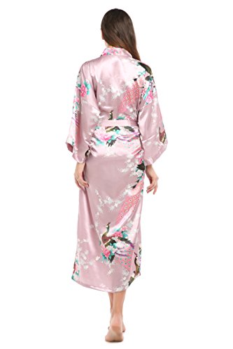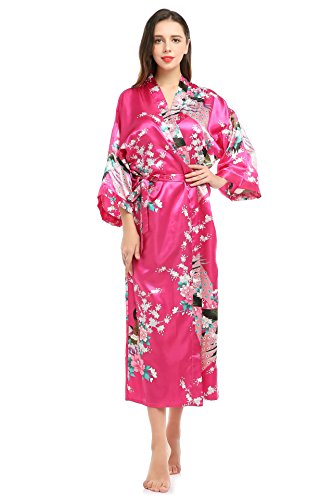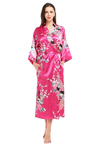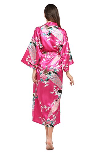 YueQiW Women's Kimono Long Robe- Silk Peacock & Blossoms With Pocket(X-Large,Fuchsia)