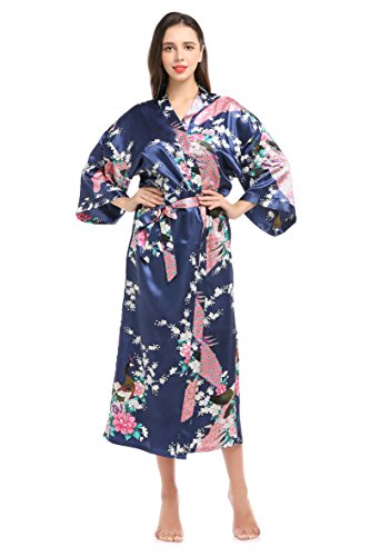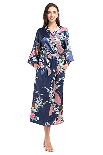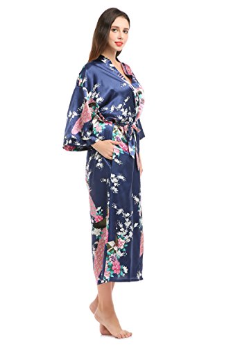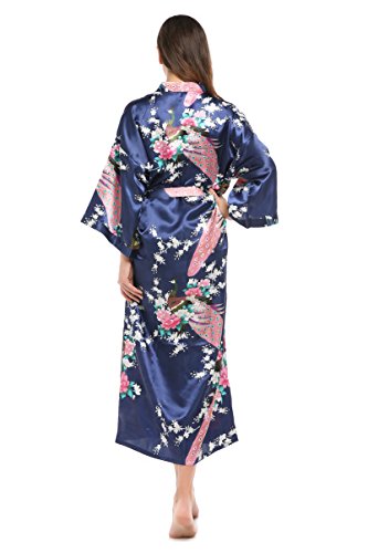 YueQiW Women's Kimono Long Robe- Silk Peacock & Blossoms With Pocket(Medium,Navy)