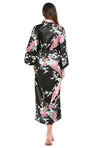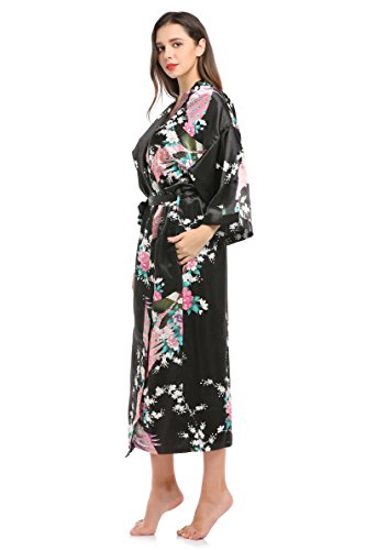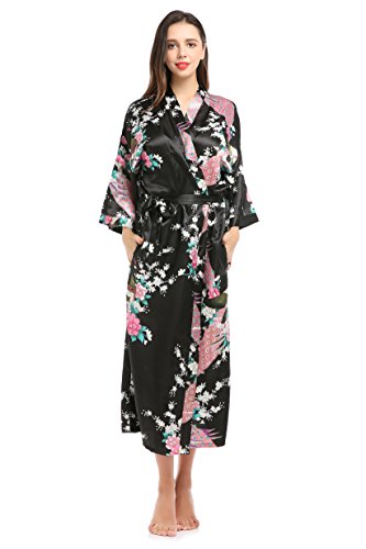 YueQiW Women's Kimono Long Robe- Silk Peacock & Blossoms With Pocket(X-Large,Black)