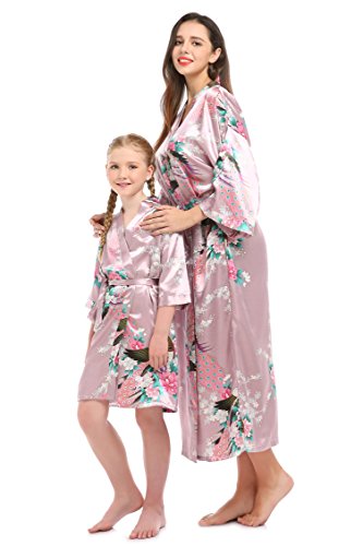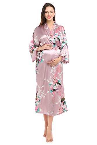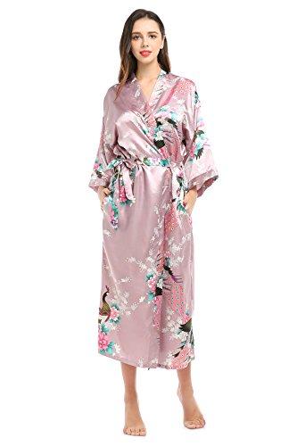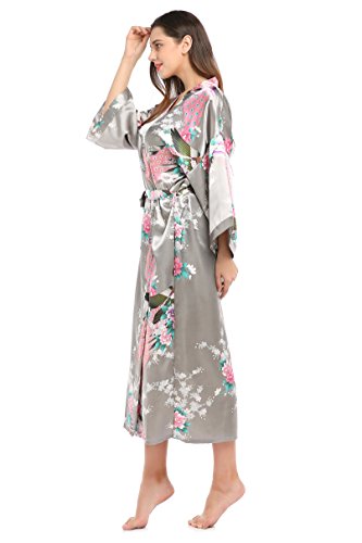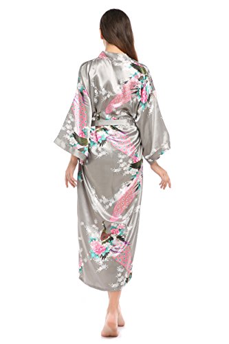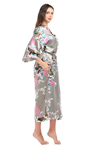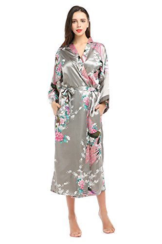 YueQiW Women's Kimono Long Robe- Silk Peacock & Blossoms With Pocket(X-Large,Grey)