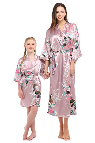 YueQiW Women's Kimono Long Robe- Silk Peacock & Blossoms With Pocket(Medium,Fuchsia)