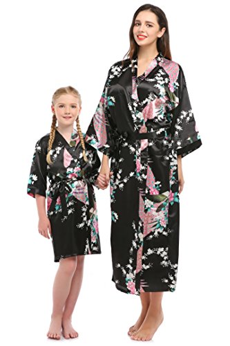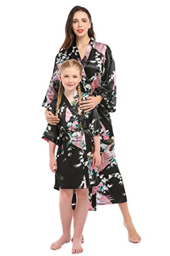 YueQiW Women's Kimono Long Robe- Silk Peacock & Blossoms With Pocket(Medium,Black)