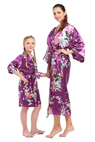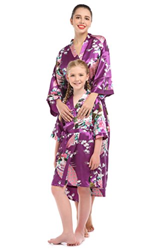YueQiW Women's Kimono Long Robe- Silk Peacock & Blossoms With Pocket(Medium,Purple)