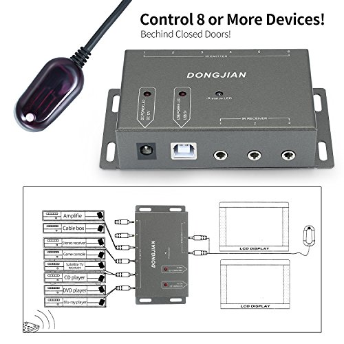 Hidden IR Repeater System: The Hidden IR Repeater System allows you to use an existing infrared (IR) remote control to operate up to 6 audio/video (A/V) components If your Home Theater components are hidden behind closed doors or walls in an entertainment cabinet or equipment closet the Hidden IR Repeater System is the accessory you need to be able to control your components with your remote Specifications: 1. Small and solid design 2. Low power consumption 3. 12V,DC,30 mA MAX 4. Input voltage:110-220V 5. Receiving Frequency Range: 34 KHz to 60 KHz 6. Emitting Frequency Range: 38 KHz to 56 KHz 7. Receiving Distance: 8 meter 8. Emitting Distance: 100-200mm 9.Cord Length: IR Emitter: 10ft(3m) ,IR Receiver: 5ft(1.5m) How to install? 1.Tape the emitters on the devices like Cable Boxes, Xbox One, Roku, Apple TV, Nvidia Shield and so on,Please tape on the nearby of infrared receiving point. 2.Fix the receiver on the most convennient place by remote control. 3.Plug the emitters receiver in the infrared remote repeater,connect to power supplies,then you could use it.