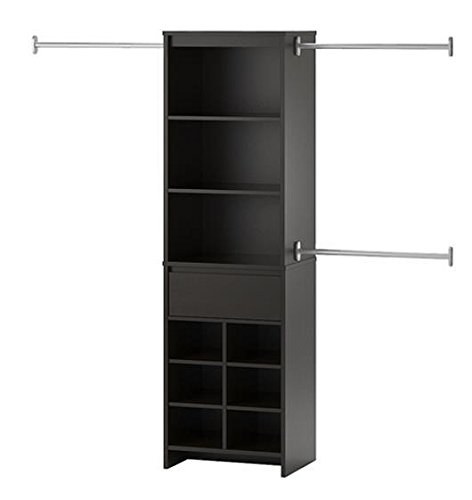 - The simple, yet sleek look of this system brings just enough storage with 3 adjustable clothing rods, 3 shelves (2 adjustable), 1 drawer and 6 shoe cubbies