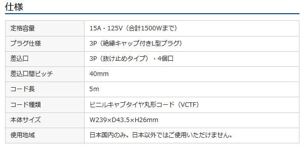 4個口(3P抜け止め)、VCTFコード仕様、3Pプラグ(絶縁キャップ付き・L型)のタップです。電源状態が確認できる通電ランプ付き。裏面にマグネットが付いているので、スチールのデスクなどに仮固定することができます。メンテナンスがしやすく便利です。 |