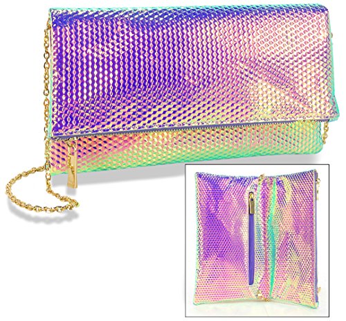 Product Description Gorgeous patent clutch includes dual compartments. The front flap opens with a zippered top opening. The second compartment is under the fold over flap and includes a zippered opening. There are hidden magnets to secure the fold over flap. It can be worn as a shoulder bag with its detachable chain shoulder strap (22.5in drop length) 0