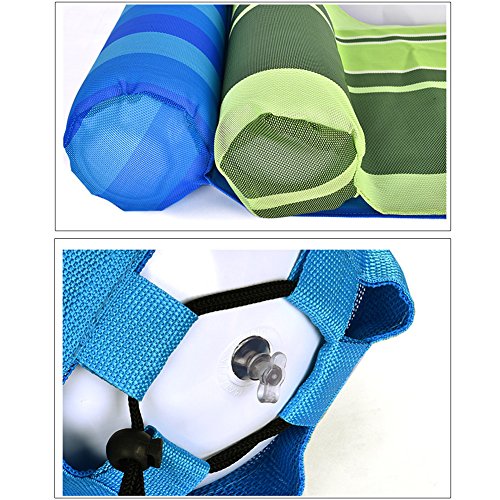 Studio : Zerlar Publisher : Zerlar Product Description Zerlar Hammock Inflatable Portable Lounge Pool Water Floating Chair Swimming Pool This is a Traditional Hammock-style Lounge Pool. Cool Floaty and Have a Great Load Capacity. No Work for a Lot of Enjoyment and Perfect Float for Reading in the Pool. Fun Floatie for Adults, It Will Make You a Great of Fun! Don't let the cheap price and your first impression deter you- give it a try in the pool before you put it aside for someone else to enjoy! Questions Answers: Q: What makes it float? A: Air Filled Floats. Q: Do you know the weight limit? A: Yes, it will handle up to 250 pounds. Q: Do you blow up the head and foot rest so it travels easy? A: Yes you only blow up the head and the foot part. You can just roll it up to travel. Feature: 1. Color: Green/ Blue/ Pink; 2. Floating hammock is incredibly comfortable and easy to stow in your boat, luggage or poolside storage; 3. Traditional hammock-style design cradles you slightly below the water's level keeping you cool and comfortable; 4. Constructed of durable Textilene mesh for comfort; 5. Size-L133xW66xH22cm / 52 inch x 26 inch x8.7 inch; 6. Recommended for adults. Package Including: 1 x Zerlar Swimming Pool Floating Water Hammock; Zerlar: Women, Fashion and Beauty. "ZERLAR" Trademark No.: 86314155 . 100% Brand New item from Zerlar, free Shipping; Hope you can get the best service from Zerlar Store.