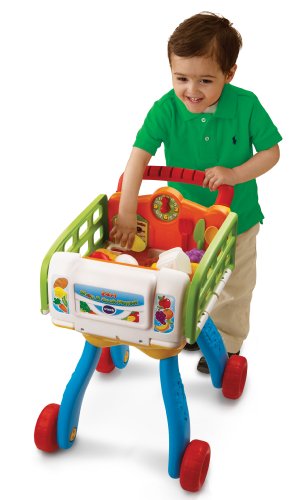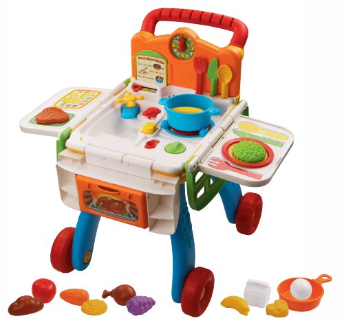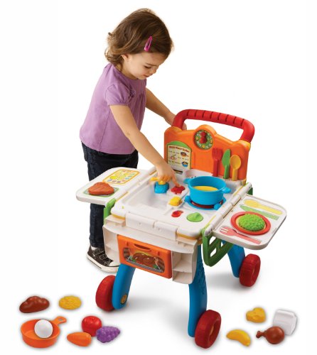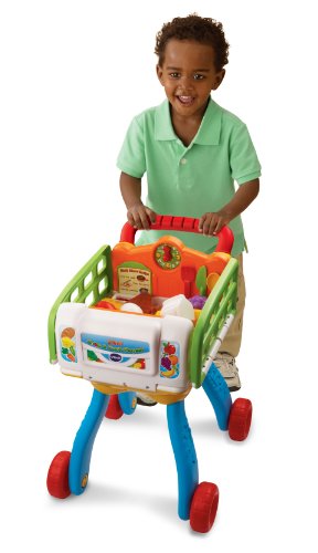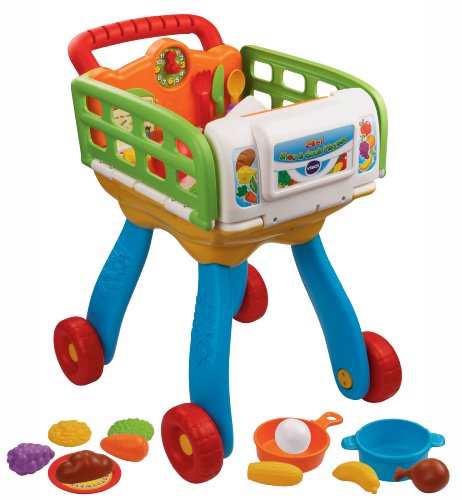 The 2-in-1 Shop & Cook Playset turns your child into a chef extraordinaire with this dual play shopping cart and play kitchen. Kids can go grocery shopping with the cart, then build meals in the kitchen. Your child will shop to sing-along songs and place food items into the cart, eliciting fun, imaginative responses. Then, your little chef will "cook" these items and have fun with the light-up stove and kitchen sound effects. The educational playset includes 20 play pieces and recognizes the utensils and cookware to teach vocabulary and pretend play. Learn numbers and counting by turning the oven knob. With six fun activities, this role-play learning toy teaches food, daily life, colors and music. Shop 'til you drop and cook up learning fun.