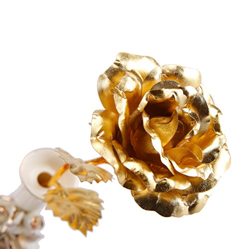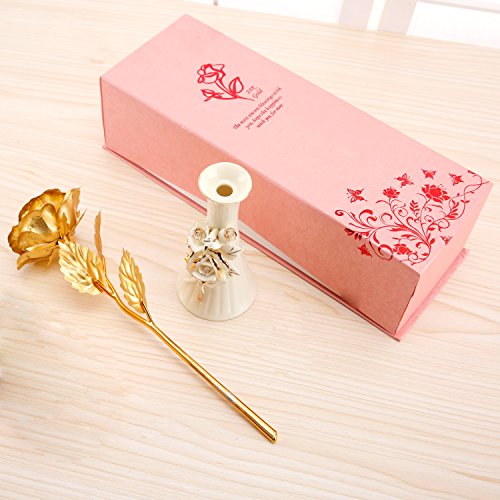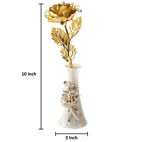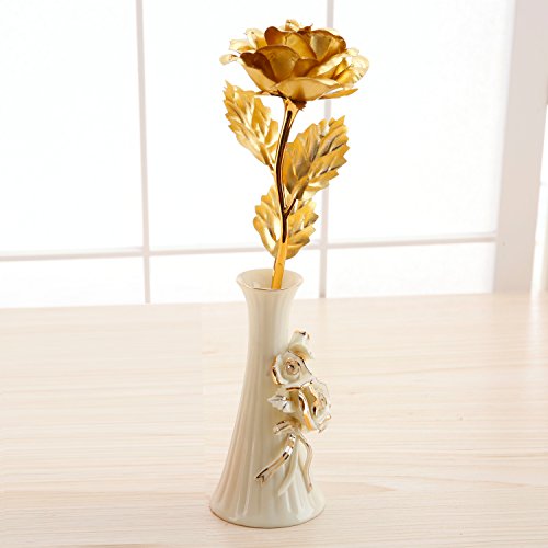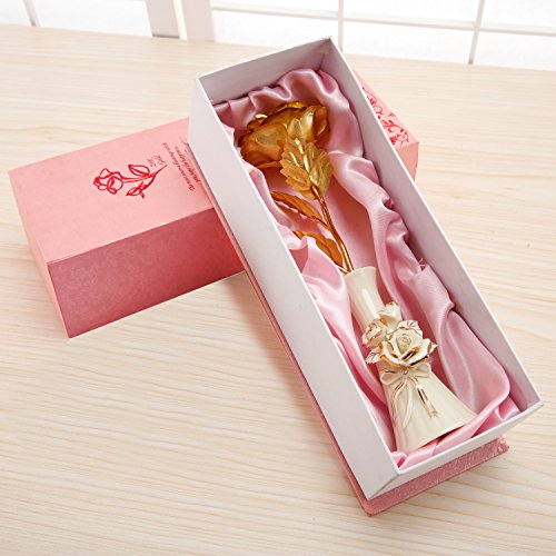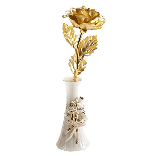 24K Gold Foil Plated Artificial Rose with Vintage Style Ceramic Vase and Gift Box