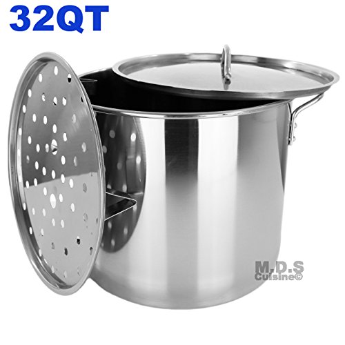 Stock Pot Stainless Steel 32QT Lid Steamer Brew Vaporera Kettle Tamales New This is a great Stainless Steel Stock pot for Tamales, Chili, Soups, Boils, Crab, Lobster, Other Seafood, or Canning. Make your favorite, Traditional and delicious recipes. Steamer insert makes this stockpot very versatile for your very large cooking needs. ALSO great for brewing BEER . Also functions as a standard stockpot for most outdoor cooking needs. Features: 32 Quart Pot (8 Gallon) capacity stock pot with steamer insert Height : 12.5" Height with Lid: 14.5" Inside Diameter: 14" Outside Diameter: 14.75" Diameter with Handles: 17.5" Weight: 8.12lb Includes Lid Steamer RackFeature